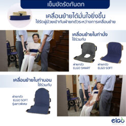 เป็นอุปกรณ์เคลื่อนย้ายผู้ป่วยติดเตียงและผู้สูงอายุ ใช้ร่วมกับรถเข็นผู้ป่วย พกพาง่ายไม่เปลืองที่เก็บ เป็นอุปกรณ์สำหรับเคลื่อนย้ายผู้ป่วย ในพื้นที่ที่รถเข็นไม่สามารถเข้าถึง ซึ่งผ้ายกตัวผู้ป่วย ELGO แต่ละรุ่น ถูกออกแบบให้มีคุณสมบัติโดดเด่นแตกต่างกัน เพื่อให้เหมาะกับความพร้อมของร่างกายของผู้ป่วยที่แตกต่างกัน