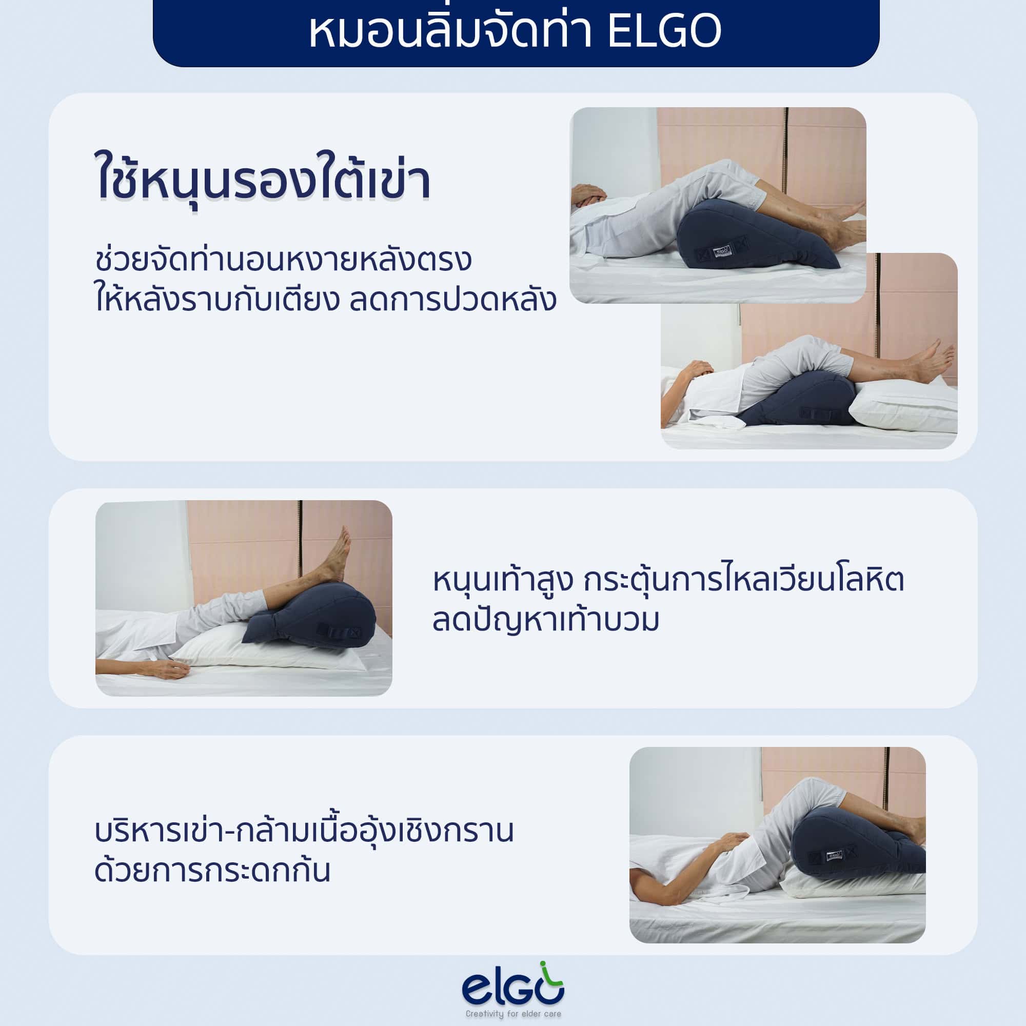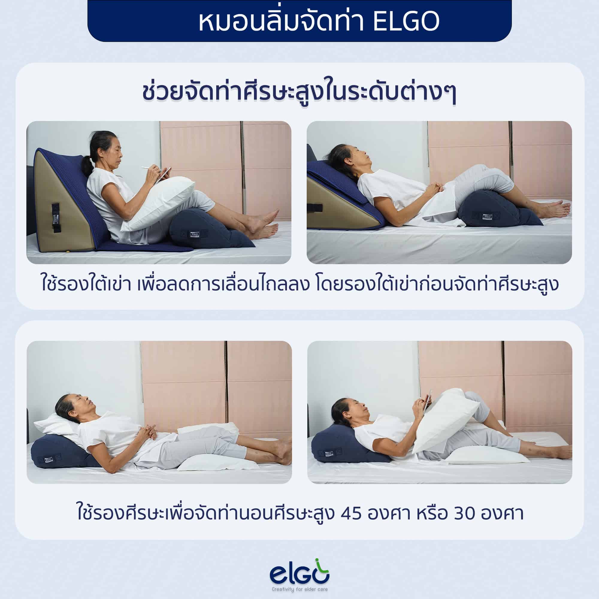 – หมอนรองจัดท่า ELGO เป็นตัวเลือกที่ดีสำหรับการดูแลผู้ป่วยให้จัดท่าสบายได้ง่าย